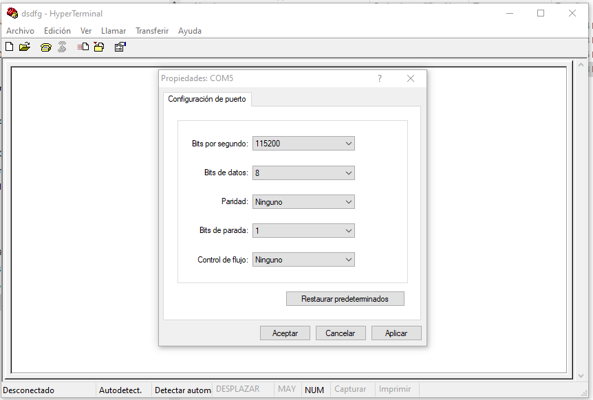 Los parámetros de comunicación son 115200, 8,N,1,N