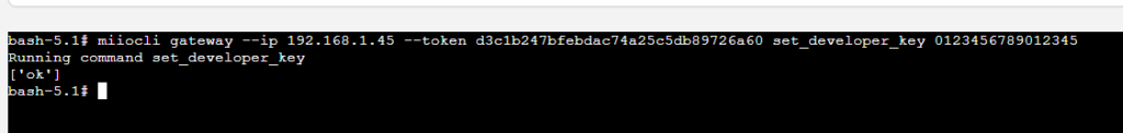 miiocli gateway --ip 192.168.1.45 --token d3c1b247bfebdac74a25c5db89726a60 set_developer_key 0123456789012345