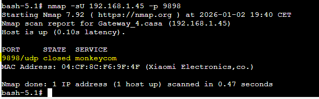 sudo nmap -sU 192.168.1.45 -p 9898